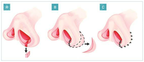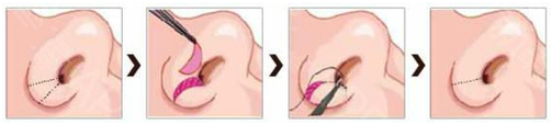 如果是轻度退缩者,鼻翼缘分离腔隙植入鼻翼缘移植物,重度者鼻孔内鼻翼软骨下端做切口,采用耳廓复合组织移植到前庭部。对于鼻翼软骨发育较好,有时为了防止术后鼻翼坍塌,会增加鼻翼缘支撑移植物;对于鼻翼软骨比较脆弱,无法支撑起鼻翼缘时,需要采用附件软骨分离,重新定位的方式。
