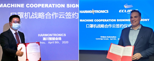 北京时间2020年4月9日,瀚川智能与加拿大Eclipse Automation公司举行了“口罩机战略合作云签约仪式”。双方签署了全自动N95口罩生产线在北美市场的战略合作备忘录:瀚川智能生产的全自动N95口罩生产线将通过Eclipse公司供应北美市场设备需求并开展安装调试和本土化服务。