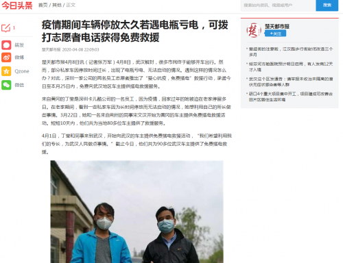 对此,汽车应急启动电源发明者——卡儿酷推出了“爱心抗疫,免费搭电”星火救援行动,承诺4月1日至4月25日,免费向武汉地区车主提供搭电救援服务。帮助广大车主及疫情防控相关车辆解决燃眉之急,为出行保驾护航。武汉楚天都市报媒体对卡儿酷的公益救援行动,也进行了报道。