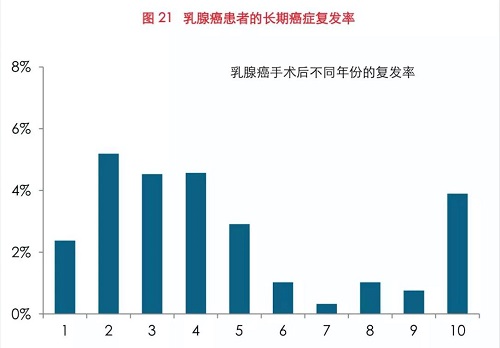 以乳腺癌为例,复旦大学肿瘤医院对 2200 多例乳腺癌患者的观察发现,乳腺癌复发的时间趋势呈现为双峰。如上图,第一个复发高峰期集中在术后2年-4年左右,第二个高峰在9.5年左右,而术后5年-9年内复发的概率比较低。