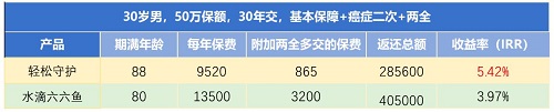 附加两全后(轻松守护两全保至88岁,六六鱼两全保至80岁),同样条件下,男性保费相比于轻松守护涨了41.8%,女性涨了27.6%。然而内部收益率又有多高?