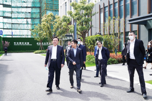 在调研中,谢光平向程向民、李谦等一行详细介绍了派米雷·佘山智地项目的规划、定位、招商运营等情况。程向民充分肯定了项目的规划和阶段招商成果,并鼓励派米雷集团放眼全球,适应百年大变局,聚焦生物医药产业的同时要扩宽招商思路,将国际高端科技企业导入园区,与政府一起把“松江制造”打出去。程向民同时表示,派米雷集团要发挥平台型企业的作用,注重全产业链发展,直面疫情带来的机遇和挑战,继续聚焦G60政策导向、学习“6+X”产业政策,运用基金平台、VC/PE平台等,把建设、招商、运营工作做到更好,争当松江区的示范代表,起好带头作用。