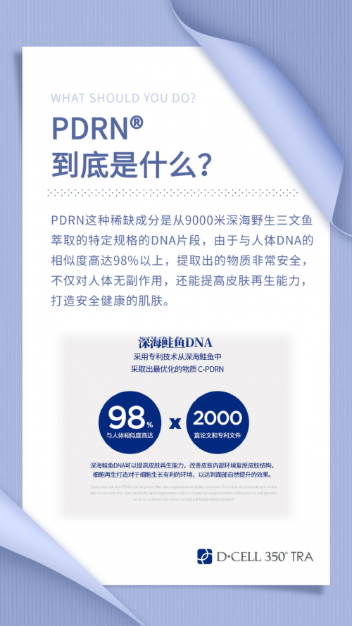 PDRN是什么呢?这是从深海鲑鱼中提取的特定规格DNA片段,它与人体DNA具有98%的相似度,因此可放心使用,不用担心会出现排异现象。PDRN还是一种小分子物质,只有毛孔大小的1/671,可深入渗透到肌肤底层,从而有效改善皮肤内部环境,复原皮肤结构,打造出利于皮肤生长的有利环境,以达到修复再生、逆龄抗衰的效果。