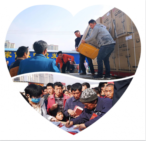 仪式现场人头攒动,热闹非凡,只见载满洗衣机的大卡车上,有的工作人员正忙着卸货,有的工作人员通过仔细核对信息表后展开发放工作,群众们分乡镇分社区进行排队领取。