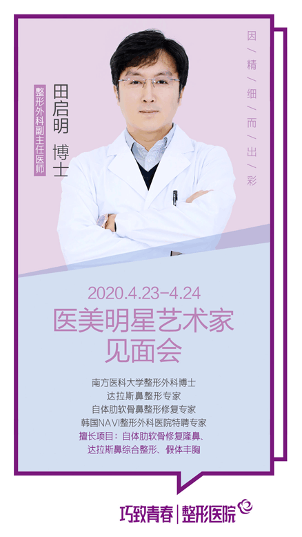 古希腊有句谚语“鼻为颜面之王”,鼻子位于面中部,的确占据非常重要的地位。为回馈新老朋友的支持与陪伴,在广泛听取求美者心声后,巧致特邀“达拉斯鼻部综合整形技术先导及自体肋软骨鼻整形修复专家”田启明博士4月23—25日来现场助阵,为港城女性答疑解惑,分享美丽心经。