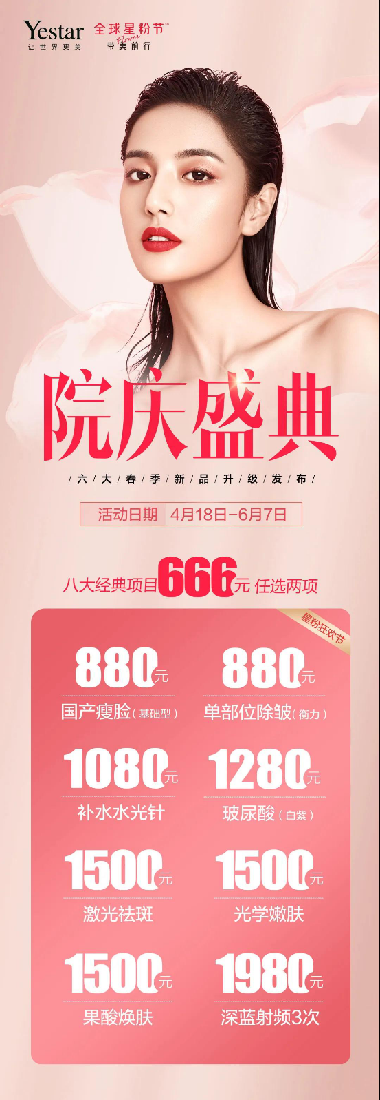 此次济南艺星6周年院庆盛典,为感恩星粉,一路与我们美丽相随,各种项目特惠,致力为您带来安全舒适的体验,开启一场浪漫的美丽之旅!