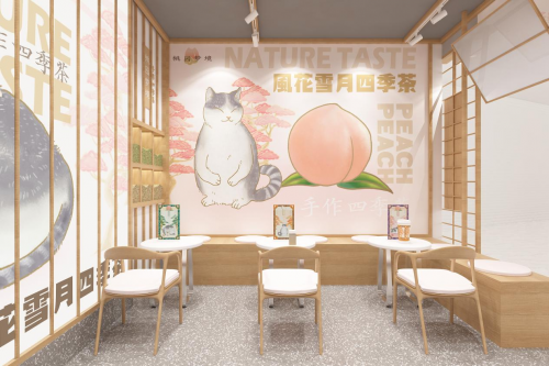 桃园梦境四季手作茶还拥有超高颜值的设计,品牌logo中运动了简约又不简单的桃子元素,桃子具有吉祥的象征,可以寓意着长寿,送上带有桃子元素的寿礼,以此祝愿家中的老人能够健康长寿。还能象征男女之间的爱情故事,表达两者两情相悦的感情。还可以带来好运,能寓意着家中生活能越过越好,象征着逃出厄运,躲避灾难。多重美好的寓意,给人留下深刻印象;以“桃”为主题,用桃与萌宠的形象结合,基于猫形象进行延伸,挖掘有趣的视觉形象作为品牌基调,形成品牌的独特核心符号,利用图形与系列辅助元素,丰富品牌视觉。视觉新亚洲创意结合空间极富东方美学,创意十足。