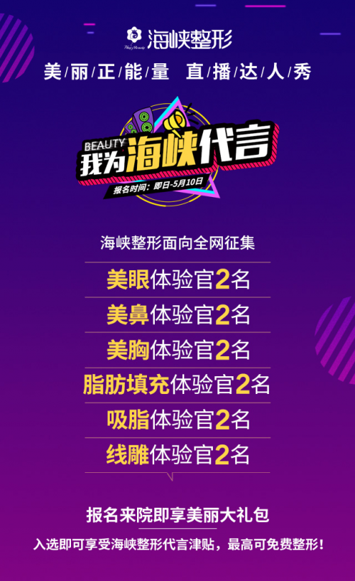 入选仙女还可以享受到济南海峡美容整形医院代言津贴(抵扣手术费),最高可免费整形,享受到0元整形的特权福利!我们会为您进行全方位的形象塑造与包装,由医学美容整形、形象设计等领域的专家联袂组成“美丽梦之队”进行个性化打造,让您形象和气质实现整体的提升和美丽蝶变。