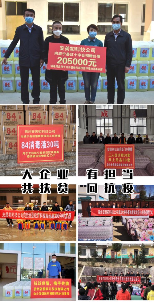 面对脱贫攻坚和2020年突如其来的疫情,富有高度社会责任感的安美初科技,向毕节市工商联、威宁县疾控中心、威宁县人民医院、大方县人民医院、大方县中医院、金沙县人民医院、小海镇人民政府、金海湖工业园区企业服务中心、市投资促进局及各县区教育单位20余家捐赠84消毒液300余吨,以对抗疫情。