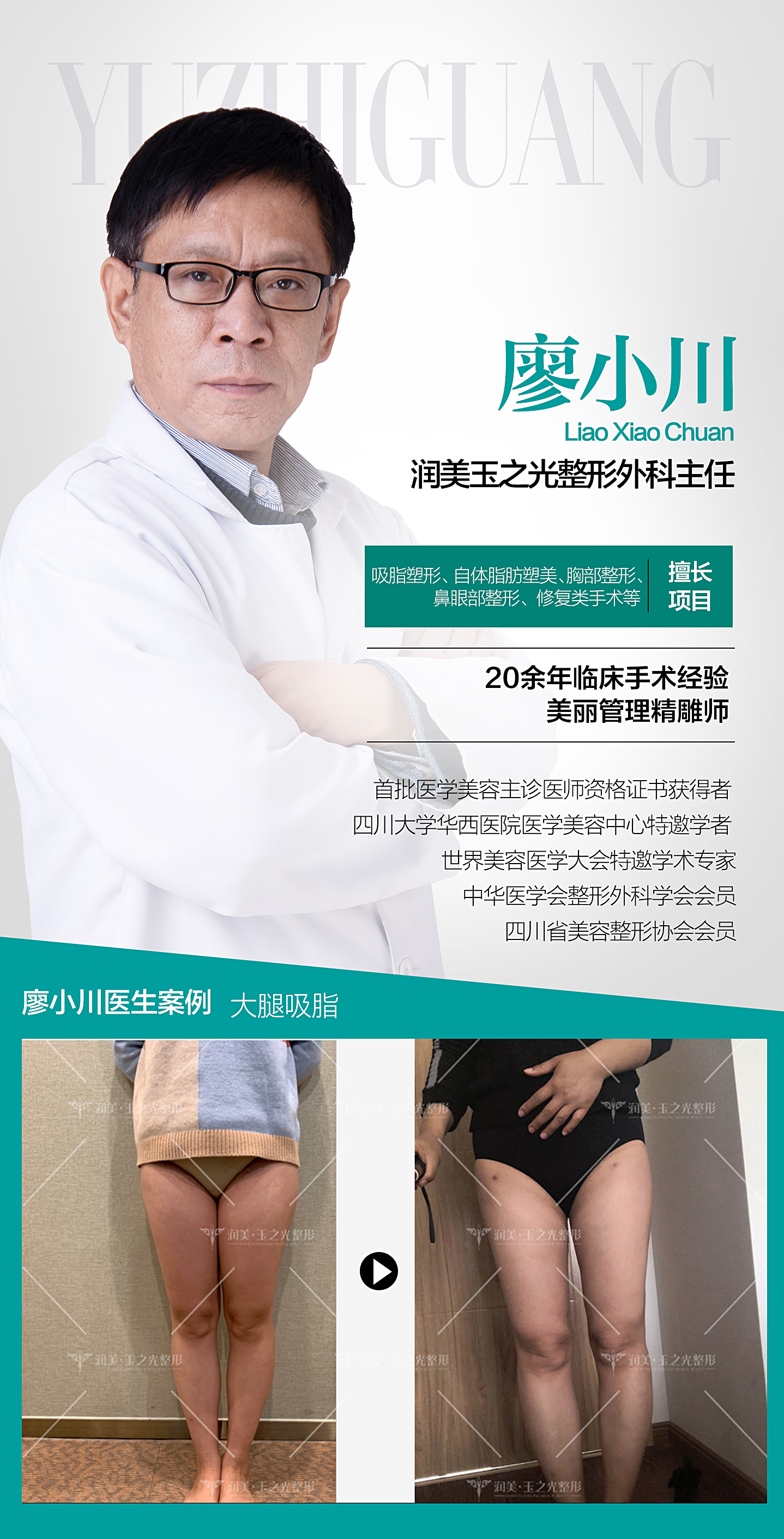 廖小川,成都润美玉之光美容外科主任、中华医学会整形外科学会会员、四川省美容整形协会会员四川省烧伤整形外科专委会委员、首批医学美容主诊医师资格证书获得者、四川大学华西医院医学美容中心特邀学者、世界美容医学大会特邀学术专家。
