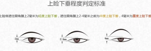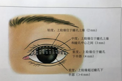 上睑下垂程度判定标准分为:轻度上睑下垂、中度上睑下垂、重度上睑下垂(见图)
