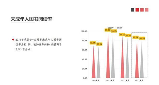 根据上述报告公布的数据,梳理发现,从未成年人的阅读率来看,2019年0—8周岁儿童图书阅读率为70.6%,较2018年的68.0%提高了2.6个百分点;9—13周岁少年儿童图书阅读率为97.9%,较2018年的96.3%提高了1.6个百分点。