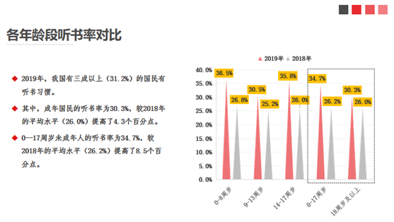 其中,成年国民的听书率为30.3%,较2018年的平均水平(26.0%)提高了4.3个百分点。0—17周岁未成年人的听书率为34.7%,孩子们越来越习惯和接受听读这种形式。