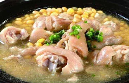做法:1、姜切片,猪脚在开水中焯一下洗净,黄豆提前在水中泡一会儿。 2、高压锅内放入黄豆、猪脚、姜片,加入适量水,煮20分钟。 3、打开锅盖,放入葱花、盐,调味可食。
