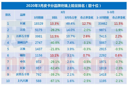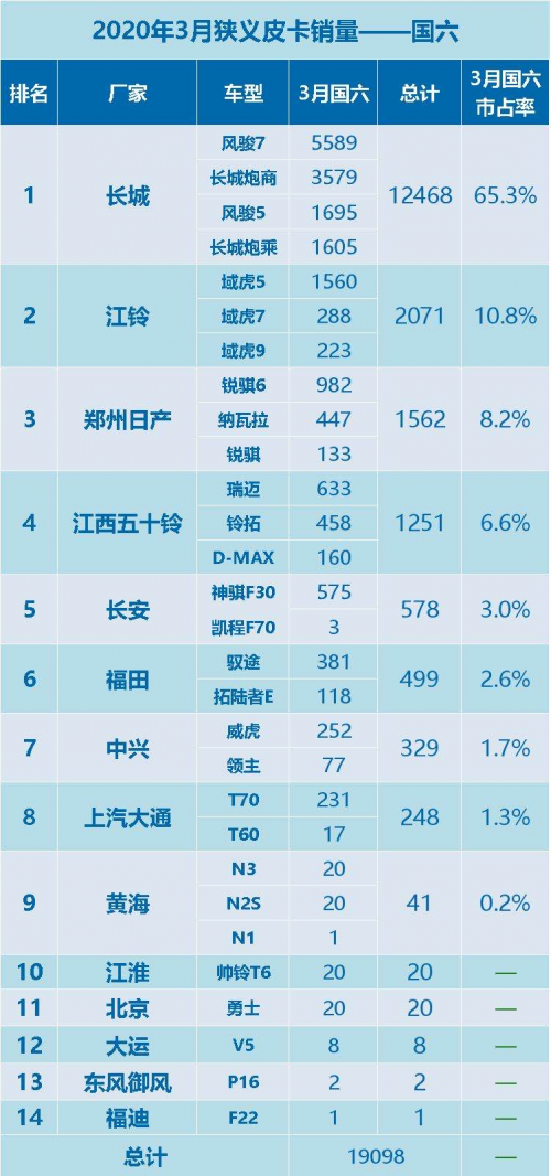 根据皮卡市场终端上险量显示,长城皮卡3月售出18329台,同比增长13.3%,不仅蝉联品牌销量榜首,旗下风骏7、风骏5及长城炮也勇夺单车型销量冠、亚、季军,而在国六皮卡市场,其销量更是一路高歌,占比超过60%。长城皮卡逆天的发展速度震惊了众多车迷,以致于有人疑惑:其凭何领跑国六皮卡市场?要我说,这还得从它的市场布局讲起。