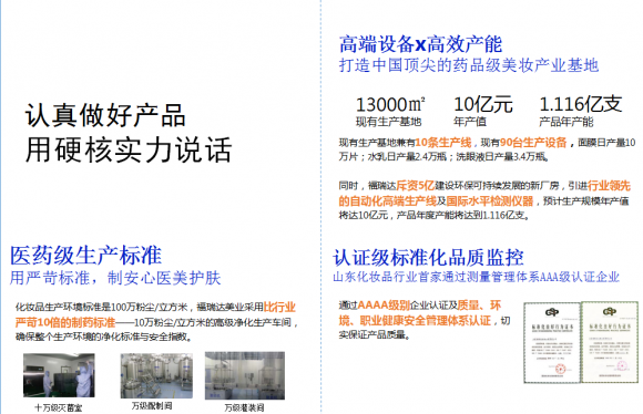同时,福瑞达斥资5亿建设环保可持续发展的新厂房,引进行业领先的自动化高端生产线及国际水平检测仪器,预计生产规模年产值将达10亿元,产品年度产能将达到1.116亿支。福瑞达美业认证级标准化品质监控,是山东化妆品行业首家通过测量管理体系AAA级认证企业,通过AAAA级别企业认证及质量、环境、职业健康安全管理体系认证,切实保证产品质量。