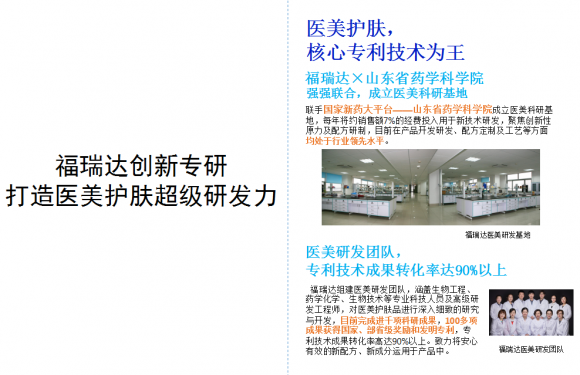 妆药同源,美出名门。拥有强大医药企业背景的福瑞达美业,是山东省护肤化妆品行业中研究实力最强,质量控制规范,生产规模较大的企业。福瑞达美业秉承匠心精神,用制药的理念研究化妆品,开创了国内玻尿酸护肤品研发的先河。福瑞达美业与国家级新药研发技术大平台——山东药学科学院联合成立研发中心,依托国际领先的玻尿酸研究开发水平,成为国内最早进行玻尿酸、聚谷氨酸等成分护肤品的研发、生产、品牌营销及OEM/ODM的化妆品科技企业。福瑞达美业也是玻尿酸“原液”类护肤产品的开创者和领军者,最早推出的“日抛(次抛)原液”等成分产品已成经典,引领行业且经久不衰。我们相信,在这样的文化背景和企业理念下生产出的产品,一定也是精品中的精品!