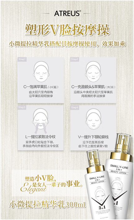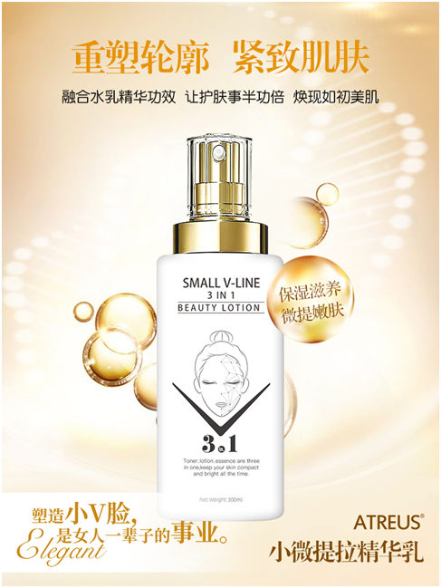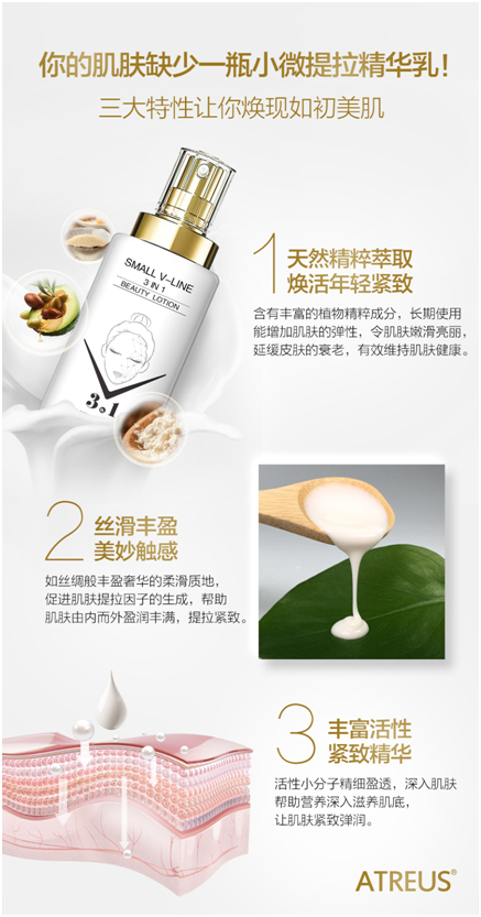 在脸上动刀,不如在脸上动手。瘦脸还是要靠自然的提拉紧致,呈现出来的效果才是自然安全。试试这款ATREUS小微提拉精华乳,能够拯救松弛肌肤,提拉瘦脸。这款精华乳,最突出的亮点就是,一瓶精华乳就融合了水、乳、精华的功效, 简单来说就是一瓶顶三瓶。想想早上起来要花半小时护肤,有这个时间,不如用ATREUS小微提拉精华乳,一次就搞定水乳精华的护肤工作,省下来的时间还可以多睡一会美容觉,这不是一举两得吗?