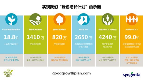 “绿色增长计划”的“六大承诺”包括,让作物更有效率地生长、拯救更多的耕地、促进生物多样性,帮助小农户、确保农业从业人员安全以及关爱每一位工人。具体目标包括在不消耗更多土地、水和资源投入的前提下,将世界主要作物的平均产量提高20%;提升濒临退化的1000万公顷耕地的肥力;在500万公顷耕地上提高生物多样性;接触2000万小农户,帮助他们提高产量的50%;为2000万农场工人提供劳动安全培训,尤其是在发展中国家;在整个先正达供应链中开展公平劳动项目。