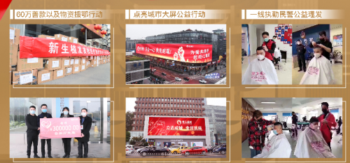抗击疫情,人人有责!我们新生植发作为中国万千平凡企业中的一员,肩负社会和担当,义不容辞。疫情期间,我们联合众多传媒公司一起行动,在多个城市点亮公益大屏,致敬奋战在一线的医护人员!除公益广告之外,我们企业连同员工共募捐了30万现金及30多万物资,共计60余万支援湖北疫情,此外还为一线执勤民警提供上门公益理发,捐赠口罩等实际行动助力工作者。