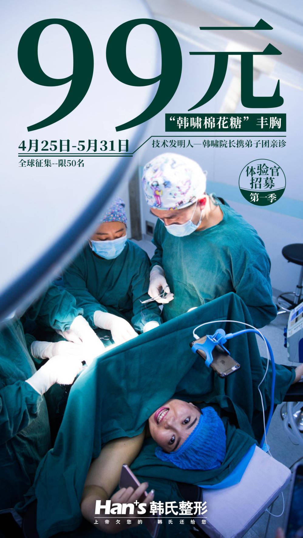 据了解,济南韩氏整形外科医院举办的这场“99元局麻做棉花糖丰胸”活动,于4月25日—5月31日期间举办,由技术发明人——济南韩氏整形外科医院院长韩啸先生携弟子团亲诊。