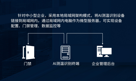 针对中小型企业,采用本地局域网架构模式,将AI测温识别设备链接到局域网内,通过局域网内电脑作为微型服务器,可实现设备配置、门禁管理、数据监控等。