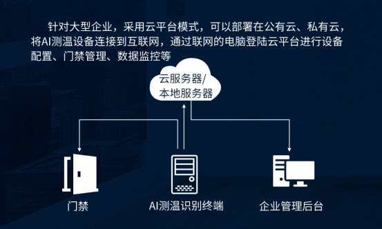 针对大型企业,采用云平台模式,可以部署在公有云、私有云,将AI测温设备连接到互联网,通过联网的电脑登陆云平台进行设备配置、门禁管理、数据监控等。