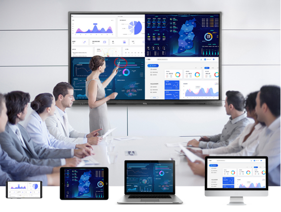 智能四分屏,实时共享,高效互动。TCL V20系列智慧会议平板同时支持4台设备分屏展示,对比一目了然,轻松四分屏;电脑,手机,平板共享高效互动。