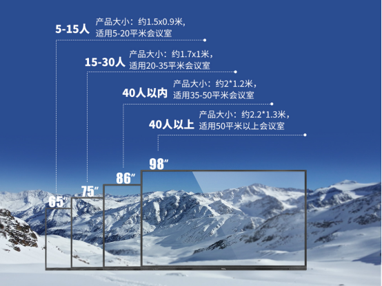 TCL V20系列智慧会议平板有65”、75”、86”、98”四个产品尺寸可选,亦可根据应用需求采用双屏或三屏方案,满足多种应用场景需求。