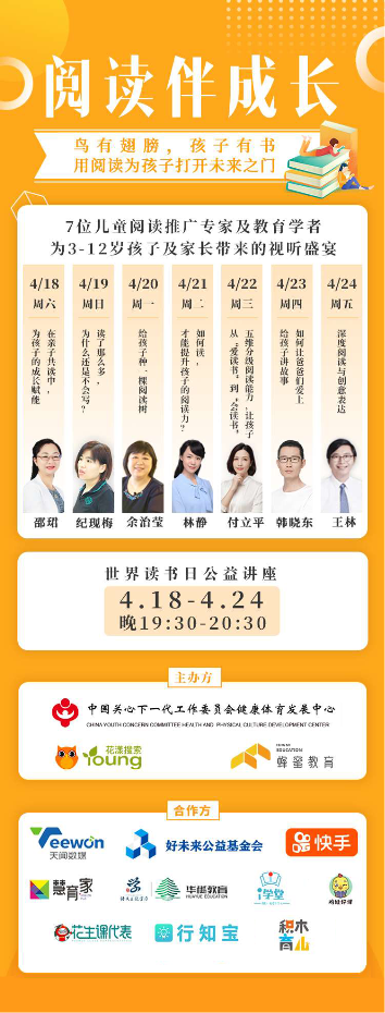 为倡导全民阅读,坚定文化自信,助力青少年成长,在世界读书日来临之际,儿童中文分级阅读教育引领者“蜂蜜阅读”联合“关工委健体中心”、“新华社花漾搜索”以及十几家合作伙伴,于4月18日至24日推出了“阅读伴成长”世界读书日公益讲座,7位儿童阅读推广专家和教育学者,从4月18日到24日,每晚19:30-20:30在蜂蜜教育直播间,对孩子阅读与写作的困惑一一作答,吸引了近30万人的收看和互动。