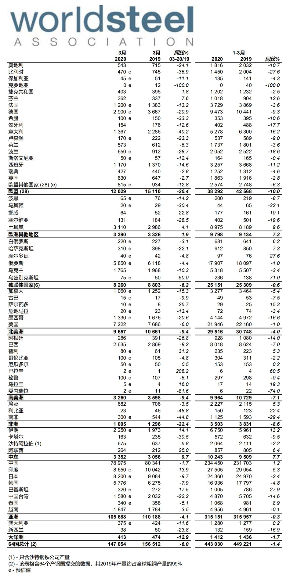 据世界钢铁协会日前发布的最新报告,2020年3月全球64个纳入世界钢铁协会统计国家的粗钢产量为1.471亿吨,同比下降6.0%。这64个国家2019年产量约占全球粗钢产量的99%。