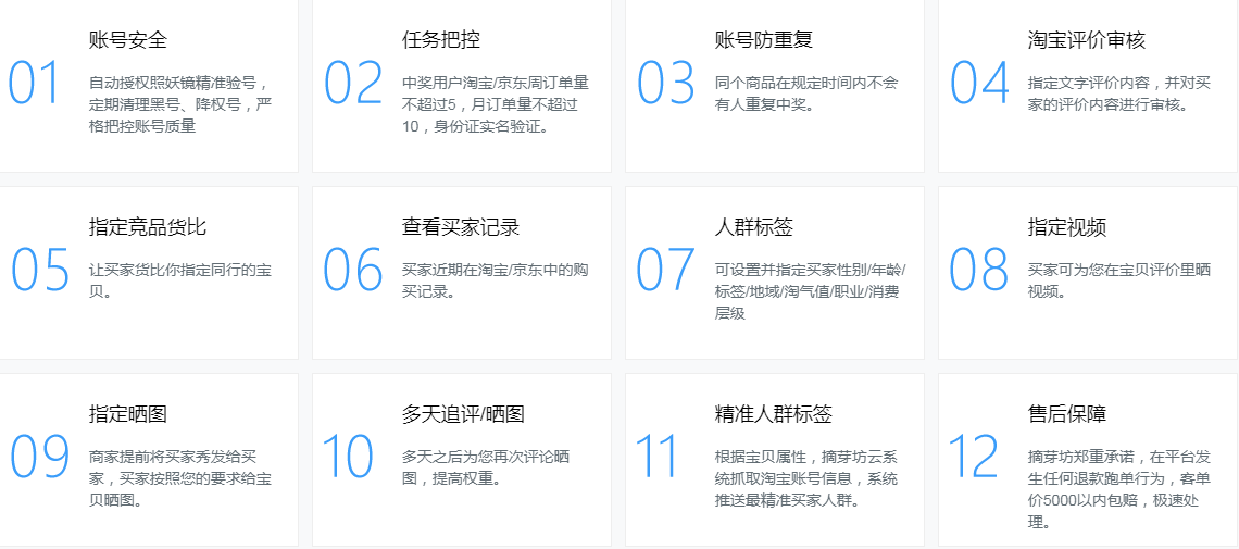 4.多维任务管理:多日任务、流量任务、多关键词、淘口令、二维码、防拍立淘、防复制关键词、防秒拍、支持永不复购、防混刷。
