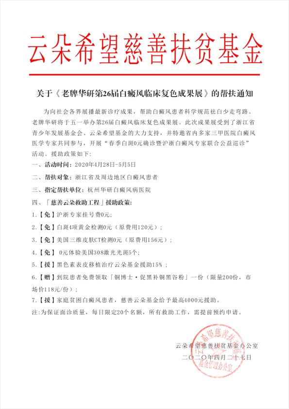【重要通知】26届成果展开幕在即,此次成果展受到希望工程浙江省青少年发展基金会、云朵希望基金的共同关注和支持,更加大了对白癜风患者的帮扶力度,云朵希望基金特下发红头文件,具体援助措施请患者朋友详读。