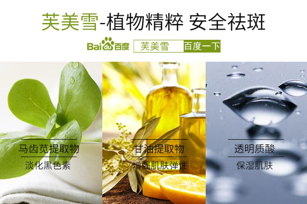 芙美雪所有的产品原材料均来自于世界各地的无污染地区,所有原料纯天然提取,能快速渗入肌肤,在不影响细胞增殖浓度的同时,能有效的抑制体内酪氨酸酶的活性,阻止黑色素的生成,从而减少皮肤色素沉积,去除肌肤的斑点,它可渗入皮肤260微米的真皮深层,从里到外彻底溶解异常黑色素,并将其全部排出。同时全面修复已经受损的色素细胞,使其以后不再分泌异常色素从而达到彻底治斑不反弹。