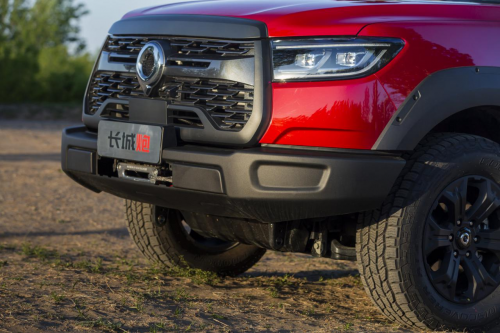 看完货箱,我将目光转向长城炮越野皮卡的前半身,其前脸采用梯形喷塑中网与铁质保险杠设计,两边搭配全LED光源的鹰眼式造型大灯,加上经典红黑拼色,整体给人感觉极具张力与视觉冲击力,非常符合颜值主义的期待。
