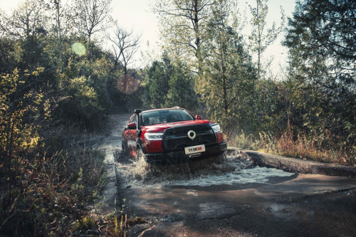 接下来是涉水路段和台阶坡道的考验,虽然路面积水并不浅,但长城炮越野皮卡凭借700mm超高涉水性能,仍如蜻蜓点水般“划”过了该路段;而在攀爬台阶坡道时,为了提升越野乐趣,我特意关掉ESP,将驾驶模式切换至越野专家模式,然后仰仗多年越野经验,在三把锁、多连杆后悬架等硬件配合下,直上坡顶,中间丝毫没有“卡壳”,成就感瞬间爆棚!