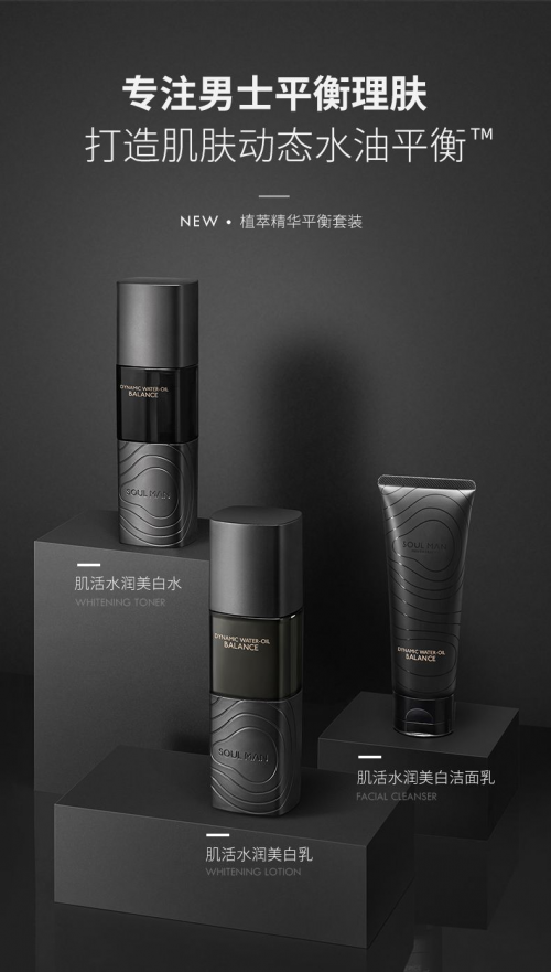 极男SOULMAN依托广妆实验室的科研力量,进行自然萃取和科技精研而出的“动态水油平衡”核心专利技术,从多种珍稀植物中萃取出水油调和的灵魂成分,促进肌肤3D调和循环与自我调节,实现肌肤动态水油平衡,让男士肌肤从此告别油腻、干燥、暗沉困扰。以自然萃取与科技精研,实现肌肤动态水油平衡调节能力,长效保持最佳状态。