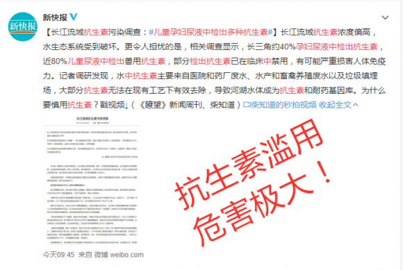 近日,微博上一条有关「抗生素」的热搜,引发网友广泛讨论。原来,是一份最新的研究报告表明:“长三角约40%孕妇尿液中检出抗生素,近80%儿童尿液中检出兽用抗生素,部分检出抗生素已在临床中禁用,有可能会严重损害人体免疫力”。