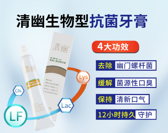一支牙膏如何做到消灭如此“狡猾”的细菌呢?原来秘密在于其核心成分。清幽牙膏中含有的四大活性成分,具有天然的抑菌抗炎作用,相互协同能直接破坏幽门螺杆菌的生存环境,抢夺、转运其生存必须的“食物”铁离子,溶解细菌细胞壁,粉碎牙菌斑,每一点都是对幽门螺杆菌的致命打击。