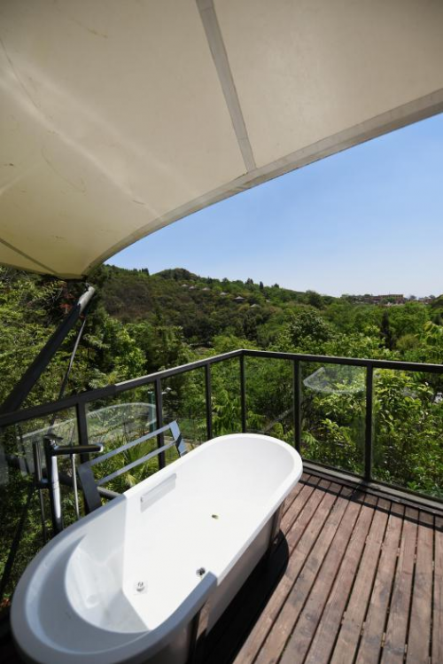每一个帐篷的房顶用5公分厚的橡塑保温隔热材料铺设,墙体用中空玻璃铸就,地面铺设豪华地毯;房间内配置空调、平板电视、沐浴卫生间等;每个帐篷门口有一小院子,种植了花草,用竹子做成的院子围栏很有情调。宾客可感受到宁静,自然,原生态氛围,放下疲惫的身心,回归心灵深处。