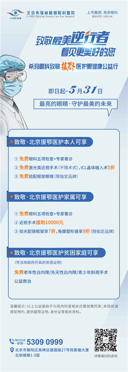 为感谢抗疫英雄们在战“疫”中的无私奉献,致敬所有援鄂一线的医务工作者,关爱他们的眼健康,北京希玛林顺潮眼科医院特发起“致敬最美逆行者·看见更美好的您”致敬援鄂医护眼健康公益活动,为所有援鄂医护人员及其亲属家人开通免费检查通道,用实际行动表达对医护工作者们的敬意和感激,传递希玛眼科公益大爱!