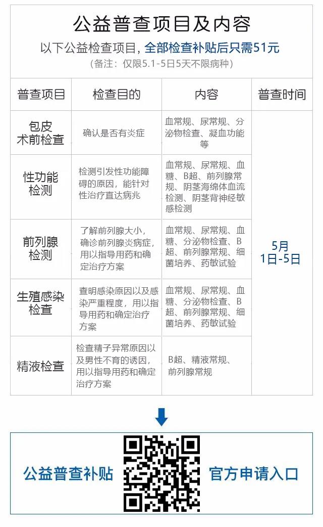 该公益活动的即将推出,对于广大男性患者来说,无疑是一巨大好消息.届时原本要几百元的检查,在享受了潍坊市公益补贴之后只要51元即可全部解决。