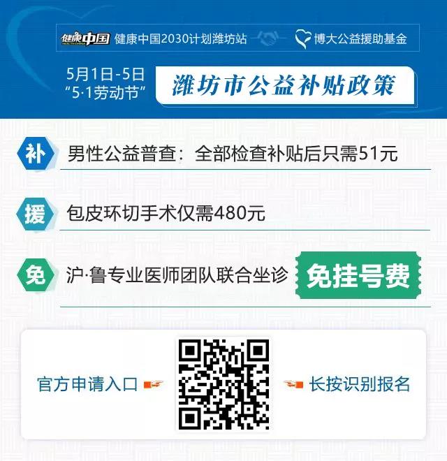 潍坊博大男科医院此次推出的“51元“优惠体检项目将在5月1日-5月5月之间推出,届时凡到该医院就诊的男科疾病患者,均可享受潍坊博大男科医院推出的“51元”优惠体检项目。此次活动优惠力度空前,错过即不再有。凡想参与者,均可长按上方二维码申请加入,从而轻轻松松享受公益普查补贴!