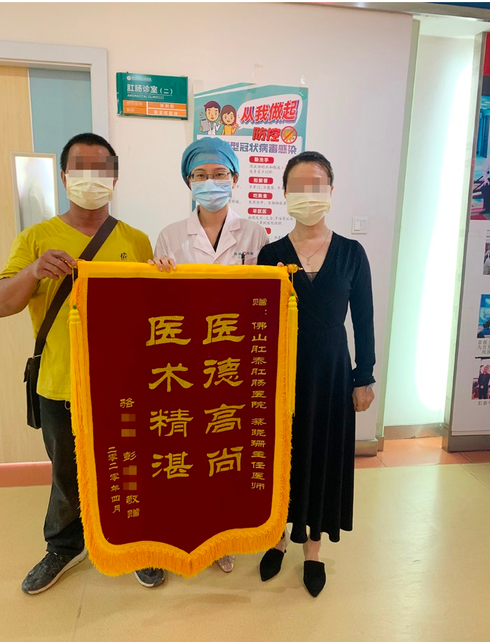 佛山肛泰肛肠医院正规吗?耳听为虚眼见为实,患者的眼睛是雪亮的。4月30日中午,骆先生和妻子彭女士带着两面锦旗,专程来院感谢医护人员。首先这对夫妻来到了肛肠专家诊疗中心,将锦旗送给了蔡晓珊主任,锦旗上绣着“医德高尚医术精湛”八个大字。在现场,彭女士和骆先生再三向蔡主任致谢,感谢她在诊疗过程中的用心和付出,敬佩她的医德和医术。