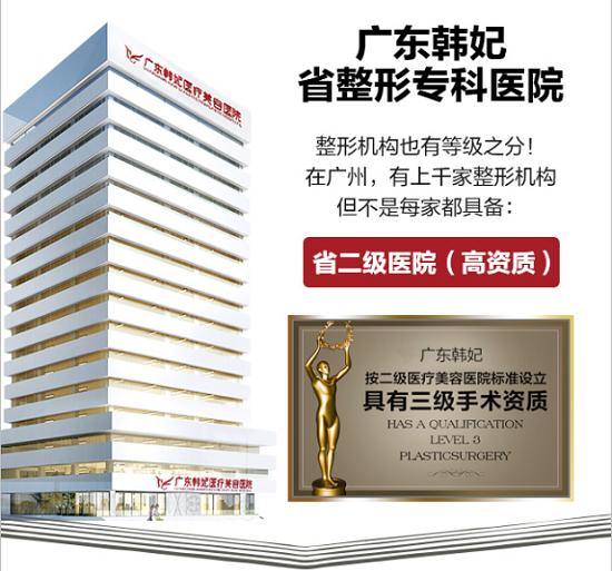 广东韩妃医疗美容医院是经过相关部门审批认证的省二级(高资质)专科整形医院,并拥有开展3级(高难度)手术项目资质;经过11年的品牌沉淀和稳步发展,在国内至今已经拥有3城5院的连锁规模,汇集了众多院长/主任/教授级骨干医师,成功举办及承办了众多高质量、高水平的大型学术峰会活动,一跃成为华南地区最大型、正规、知名的专业医疗美容品牌医院,造美实力,品质认可!