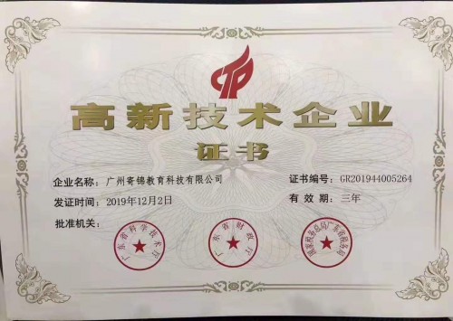 2020年4月22日广州寄锦教育科技有限公司收到了2019年12月由广东省科学技术厅、广东省财政局、国家税务总局广东省税务局联合颁发的“高新技术企业”认定证书。高新技术企业的认定是对广州寄锦教育科技有限公司司企业发展实力和潜力的高度认可,公司将继续培养高素质的人才团队;更加注重自主创新、保护知识产权,提升企业核心竟争力;继续加大科研投入,为企业发展提供有力的技术支持。