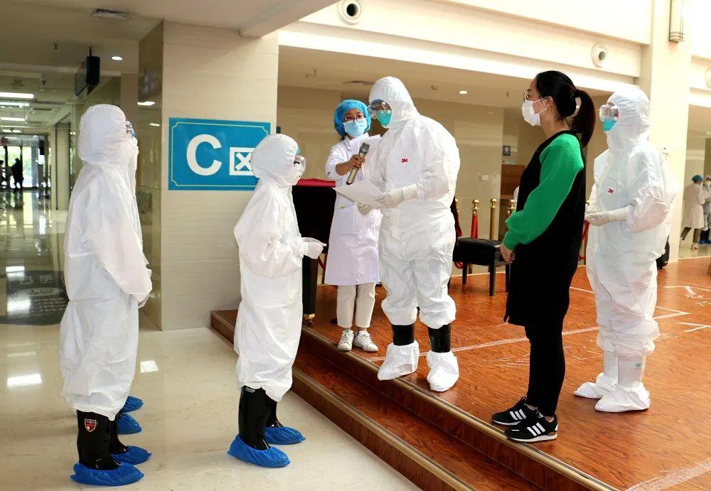 发热门诊医护人员在一次更衣室着三级防护后进诊室接诊患者。