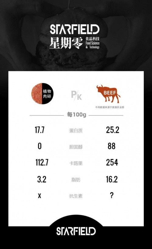 保证口感风味的基础上,星期零的植物肉也做到了更加健康。市面上许多植物蛋白肉虽然号称“人造肉”,但并没有技术革新,往往使用大量香精和添加剂,与植物肉追求健康的原则背道而驰。而星期零的产品风味来自天然植物的风味前体化合物,没有添加任何香精,坚持使用天然食材达到对模拟动物肉的更高还原度。同时,星期零的植物肉不含任何胆固醇,热量只有真牛肉的44%,而且由于生产流程透明可追溯,也更为安全可靠。