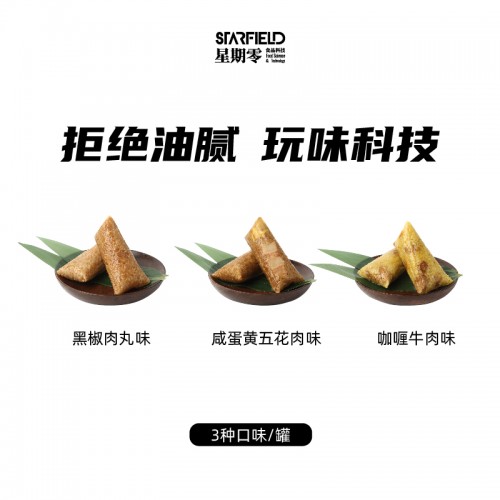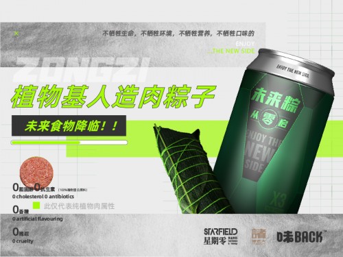 但植物肉的可能性还远不止于此,国内领先的植物肉本土品牌“星期零STARFIELD”(下称星期零)就想要探索出更多满足中国味蕾的植物产品。近日,星期零宣布与百年粽子品牌诸老大、以及中国风味零食创新品牌味back合作,推出了全球首款植物基人造肉粽子。