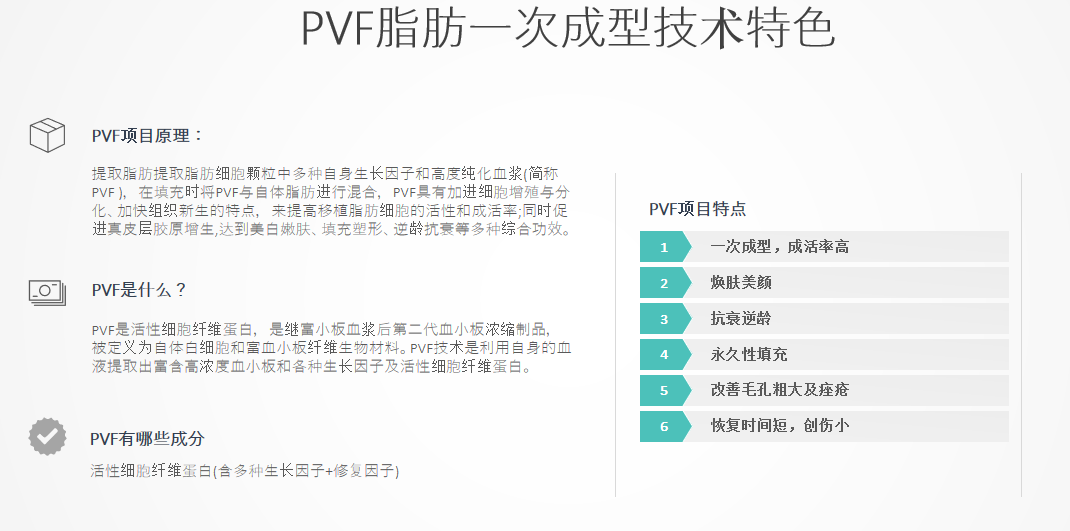 到了这个世纪脂肪移植技术得到了充分的研究还有发展,像这样包括prp,还有脂肪干细胞还有纳米脂肪这些再生医学,可以让脂肪存活率可以达到30%-50%,而我们pvf技术呢,已让脂肪存活率达到70%-80%,这个就是我们PVF这个技术的突破点!”